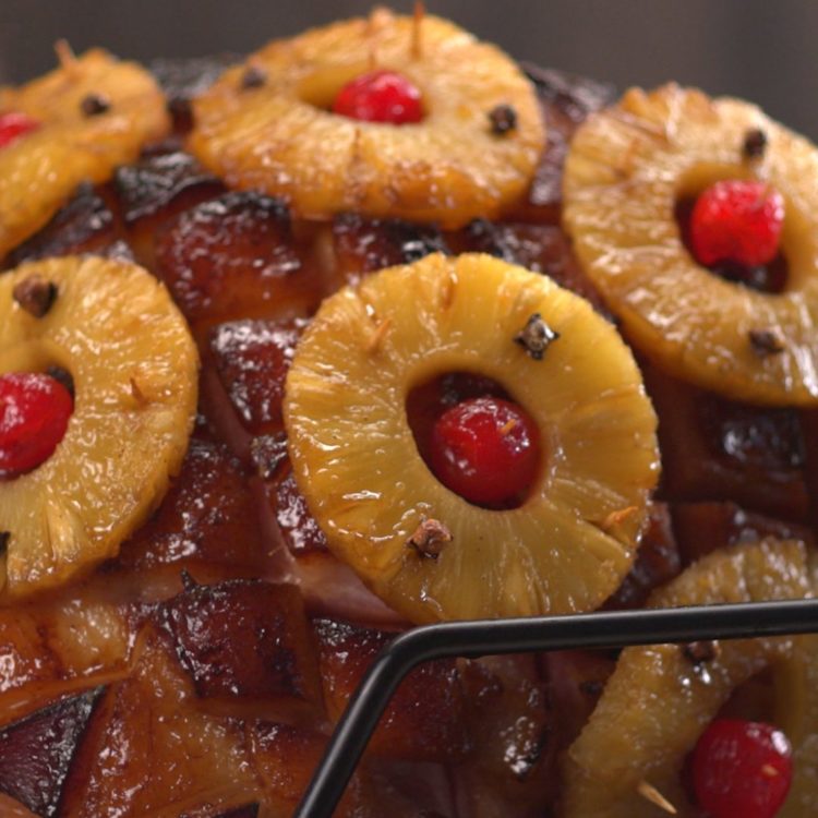 Baked Ham With Pineapple And Maple Syrup Baked Ham With Pineapple And Maple Syrup : Place ham in pan, stick cloves into rind of ham, and add syrup mixture.